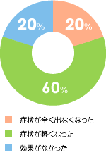 舌下免疫療法は現在、スギ花粉症とダニのアレルギー症状を根本から治すことができる唯一の治療法とされています。しかし、すべての患者さんに効果が期待できるわけではありません。2割の方が完治し、6割の方は症状が改善、2割の方は効果がありませんでした。