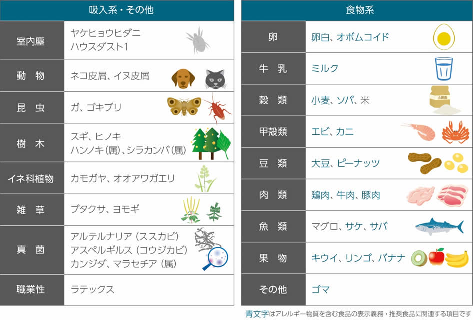 | 食物 | 魚介類(サバ、エビ、カニなど)、卵・乳製品(鶏卵、牛乳、チーズなど)、肉類(豚肉、牛肉、鶏肉など)、穀類・野菜(大豆、小麦、蕎麦など) |